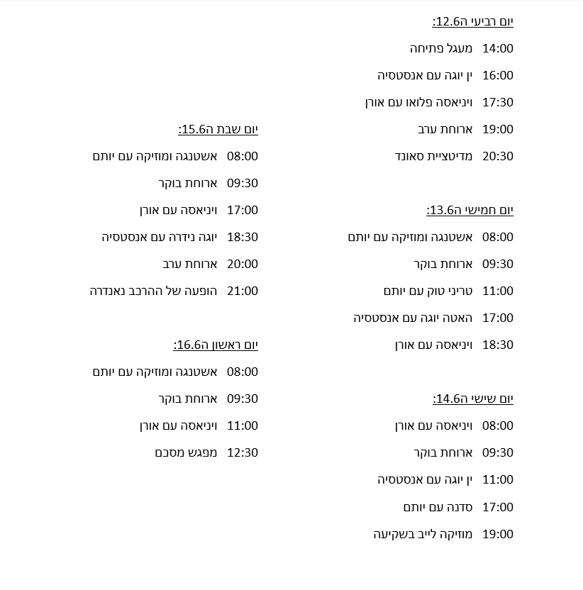 במהלך הריטריט נתרגל ויניאסה, אשטנגה, ין ויוגה נידרה עם יותם אגם ואנסטסיה קטאסורי מקפריסין.